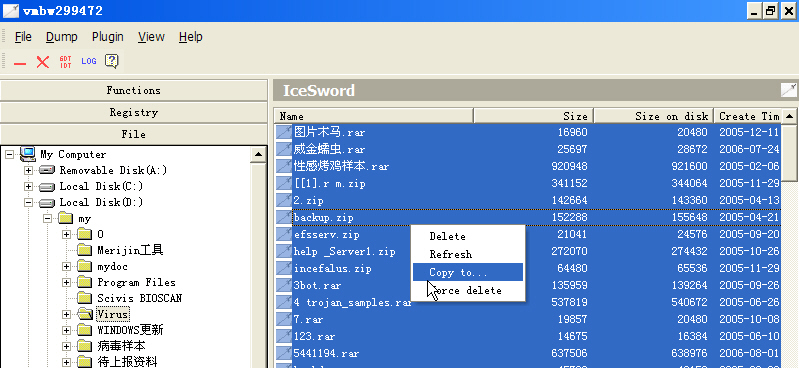 用IceSword打开相应目录,如果能看到文件,请按照下图操作,将那些文件拷贝到其他分区。