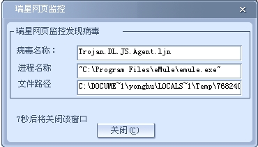 最近安装了emule下载一些资源,但是在启动时,瑞星老报有网页病毒,如图(两个,截了其中的一个图),致使该软件的浏览器首页无法显示。大家有遇到此类现象的没?有什么好的建议?