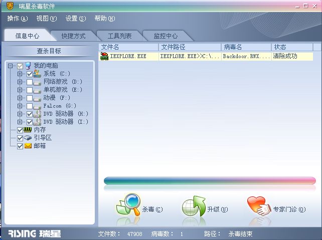 我中的内存病毒就是这个 用瑞星杀毒后显示清除成功 但重新启动后 在杀毒就又显示出了这个病毒的清除成功 郁闷死我了