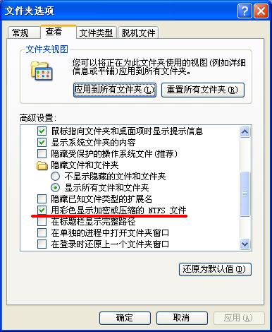 双击“我的电脑”--工具--文件夹选项,看下图,如果你红线项和我的一样打勾的话,应该是正常的,这是因为该文件所在驱动器是NTFS格式,而且勾选了“压缩驱动器以节约磁盘”的选项。