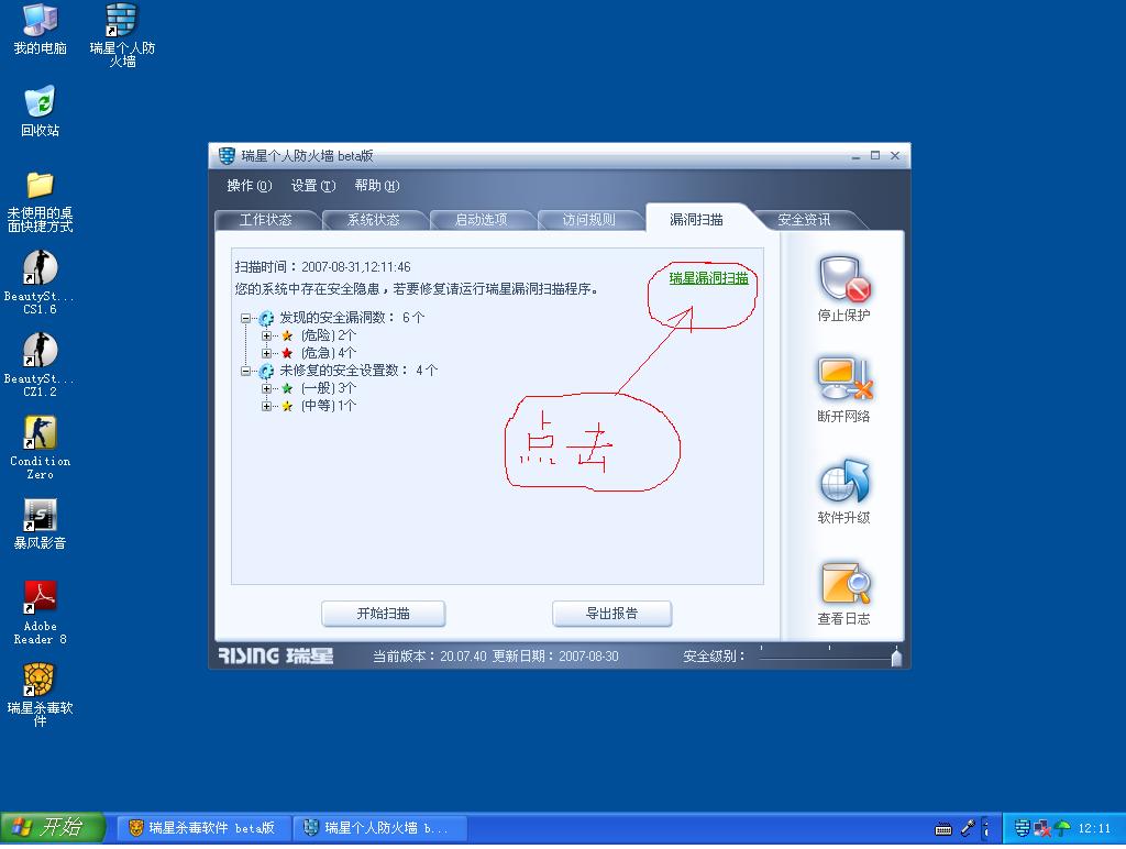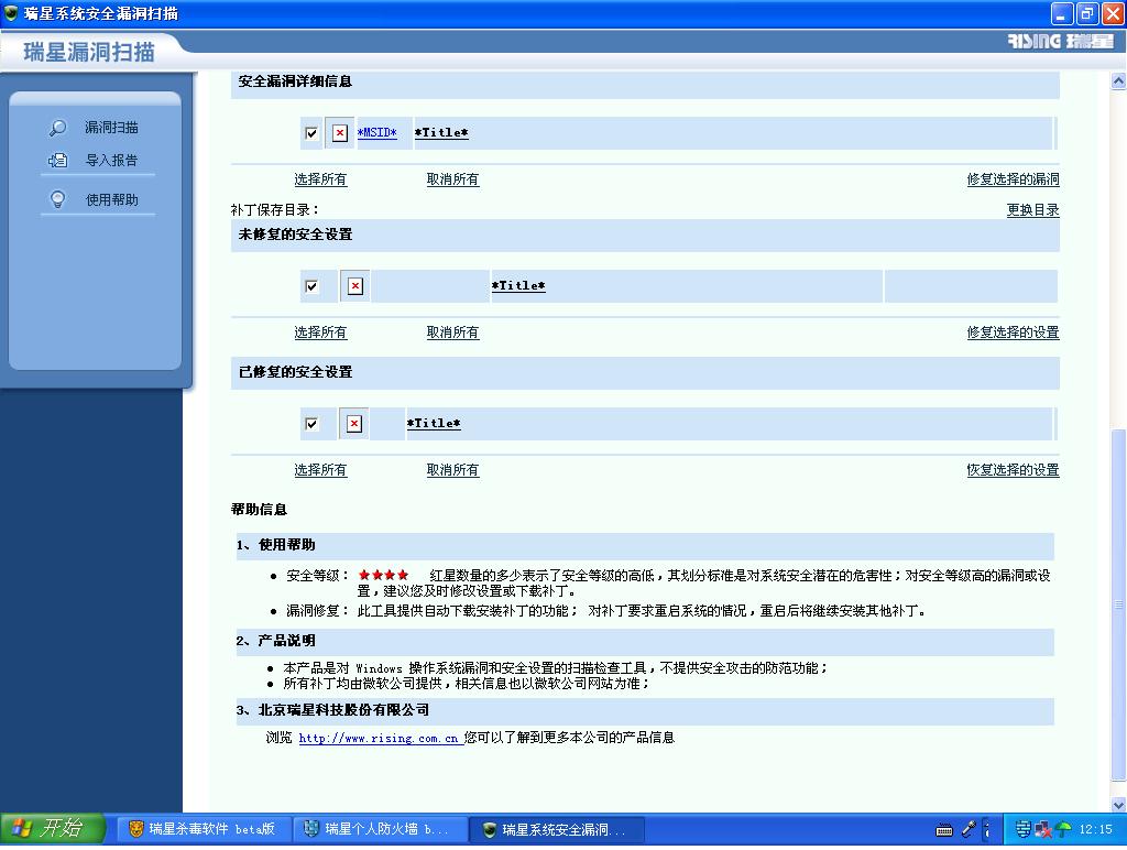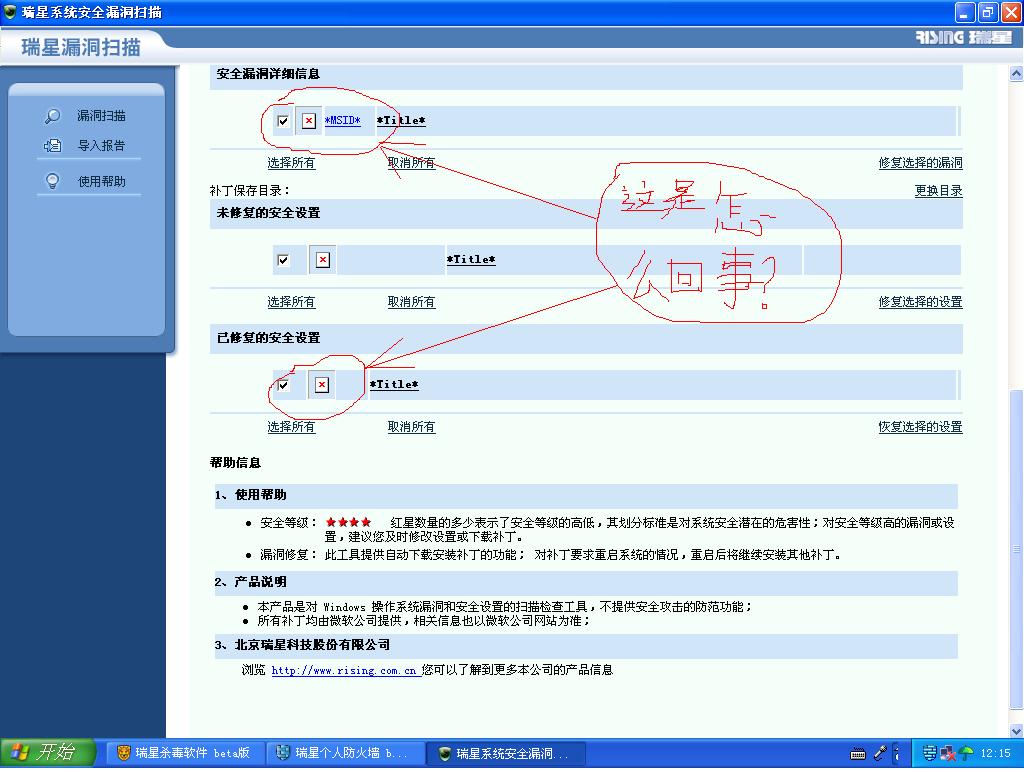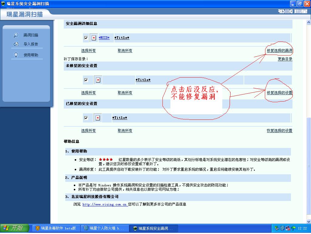 我安装瑞星防火墙后,漏洞扫描出漏洞,防火墙却无法修复漏洞,请看下面的图片,高手帮助一下。谢谢