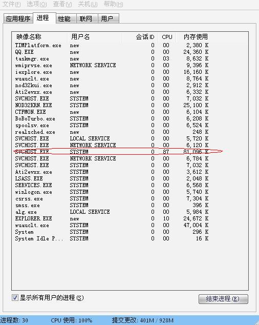 看了下进程.  主要是SVCHOST.EXE占用大多数. 但是我知道的是這個进程是系统的进程