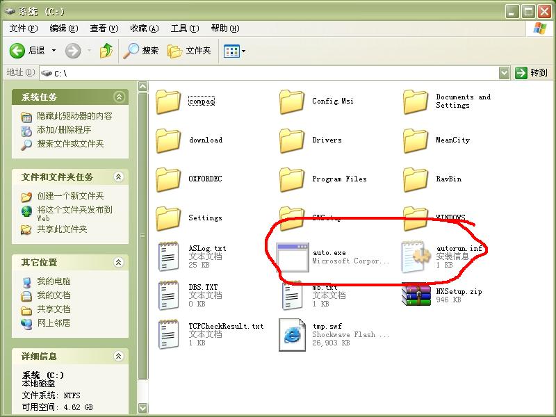 此病毒的元凶为auto.exe 他是一个木马下载器。通过U盘等移动存储传播到你的电脑中以后,在%system32%下面生成一个随机8个字母和数字组合成的exe文件
