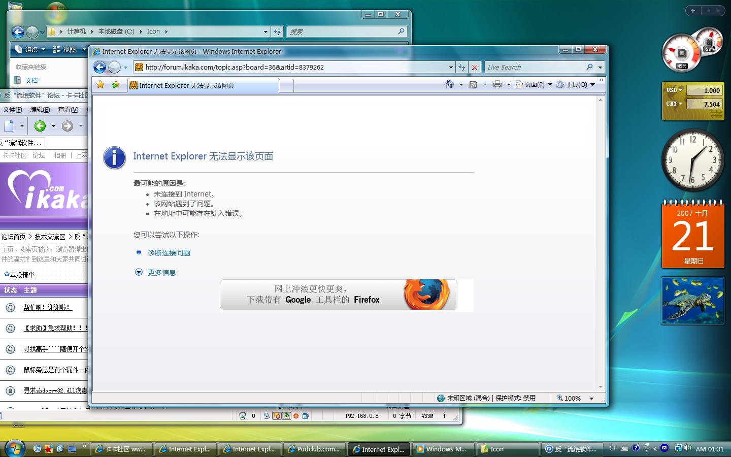 我使用的杀毒软件是瑞星的2008体验版,最近出现了一个怪现象,就是每当我打开网页的时候,就会在IE窗口顶端出现FireFox下载提示(“系统检测发现您正在使用极低版本IE浏览器,可能存在安全隐患,强烈推荐您在windows系统使用更快速!更安全!更稳定!的浏览器:FireFox火狐浏览器,点击下载” ),也没有查到有什么毒,请教各位该怎样清楚这个广告,谢谢了!