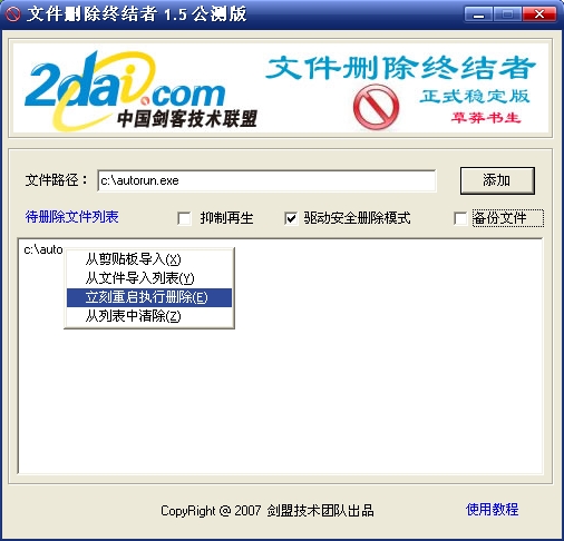 XDelBox 又名文件删除终结者,真正的DOS级文件删除工具,可有效删除杀毒软件频繁报毒重启问题依旧的恶意文件,以及unlocker,Icesword,360文件粉碎工具等删除工具无法删除的病毒文件。