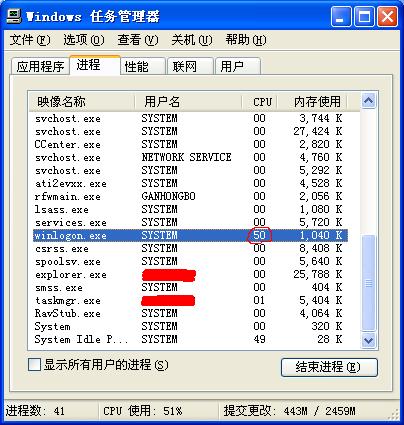 今天winlogon.exe进程CPU占用高(50%),任务管理器里只有一个winlogon.exe进程,查毒没有发现问题,重启多次还是如此,请问有什么解决办法吗?谢谢!