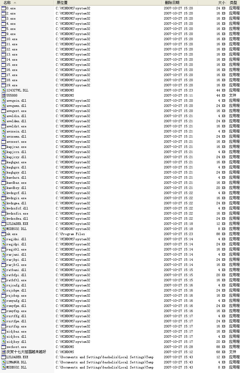 今天看到的这个样本还挺时髦,植入系统后,释放的一个文件叫“庆贺十七大祖国越来越好”。此文件标为系统重启后重命名(不知会命名成那个类型的文件。汗!俺没重启,就把这窝病毒灭了。)