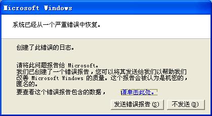 就在今天下午,我用千千静听放歌,大约放了三个小时左右吧,突然音箱没有声音,用其它播放器也是没声,检查一下,音箱没关,声卡端口原封不动(没有任何松动),查看设备管理器,声卡设备运转正常。于是我就试着停用声卡设备,系统要求重启,我没有重启,又启用声卡设备,系统又要求重启,我点击了“否”没有立即重启,我用“开始”菜单重启,一切看来均以正常的进行,但是当界面来到Windows正在关机的画面时,屏幕突然黑了,接着就很快来到平常启动计算机的自检界面(比以往重启所需时间明显少了),然后又按平常开机的过程进行,不过当中就出现了不正常关机后常出现的系统检查界面(当时是检查系统盘C盘的),XP检查完了以后就正常地进入到桌面,此时声音恢复了,进入到桌面后,出现了一个对话框,提示系统已从严重错误中恢复(跟帖附上图片),当以上过程完了以后,我用瑞星卡卡扫描了一下,发现我的系统里竟然有一个3721的流氓软件(以前扫描是没有的),瑞星卡卡提示它能更改IE的,具体说明我忘记了,不过我用瑞星卡卡清除该流氓软件了。