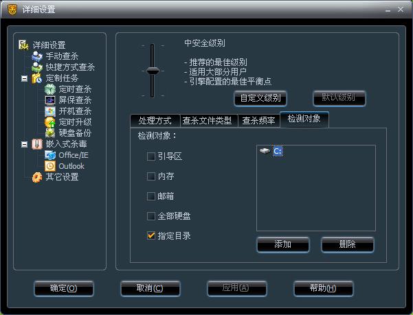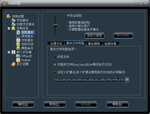 瑞星每天11点都要扫描磁盘,这样会占用系统资源,而且没必要所有文件都扫描,所以在详细设置里,定时查杀——文件类型,我们选只扫描exe文件
