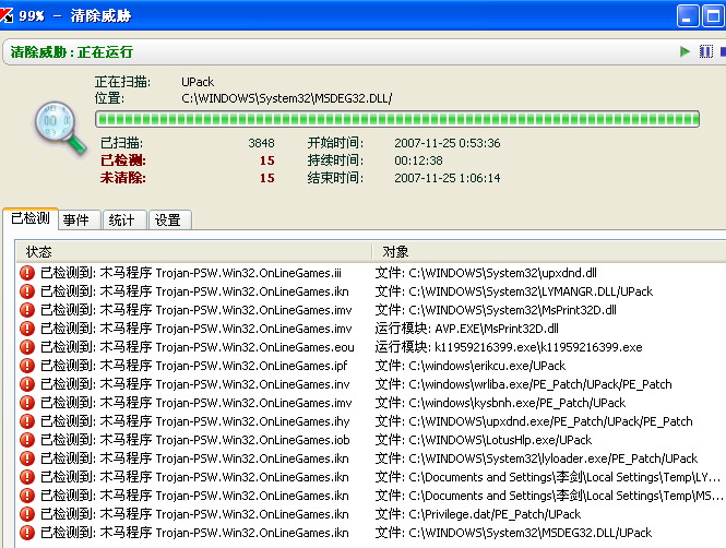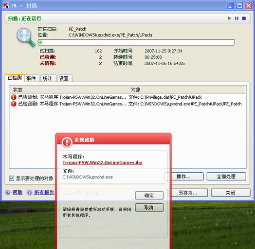 首先,我启动进入系统(我的XP安装在C盘),我的卡巴斯基杀毒软件就会提示我有病毒(木马),然后就是杀毒软件查杀病毒(如图)然后杀毒软件提示我需要重启系统才能杀掉病毒。但重启后病毒依旧还在。还有就是我系统的时间会自动被更改到2005年,连BIOS的时间也同样被更改,任凭我怎么修改也无济于事。