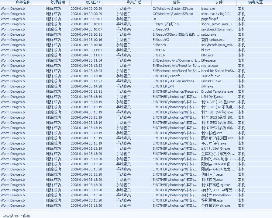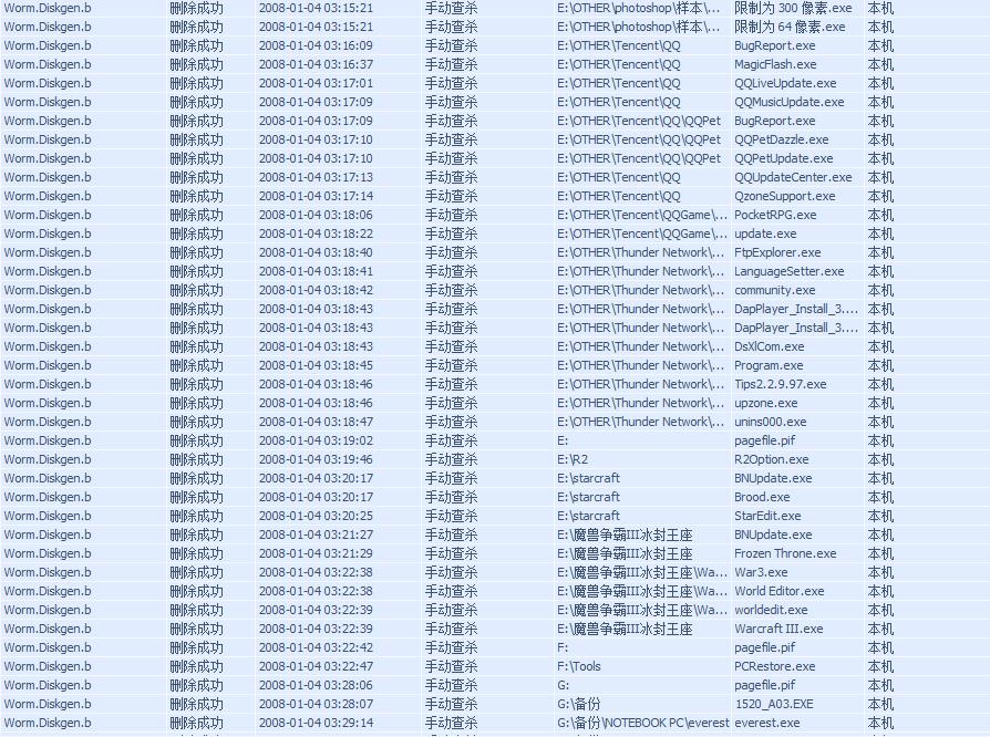 我的瑞星2008以前还正常,某天升级以后开始出现误删冰封王座的exe启动文件,但是没怎么在意,今天全盘杀毒查出88个文件,我看了,其中基本上都是游戏的文件和一些应用程序,实在不明白~~~各位看图,这是历史记录~大侠帮忙~~以后不敢杀毒了