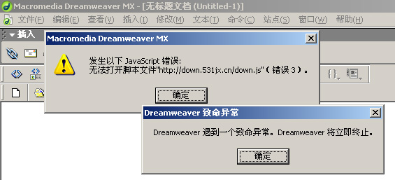 只要打开Dreamweaver马上打开错误窗口:"发生以下JAVASCRIPT错误:无法打开脚本文件'http://down.531jx.cn/down.js'(错误3)",按确定后马上弹出"致命异常"窗口:"Dreamweaver遇到一个致命异常,Dreamweaver将立即终止",再按确定Dreamweaver就关闭了,无论如何,Dreamweaver就是打不开,详见附图