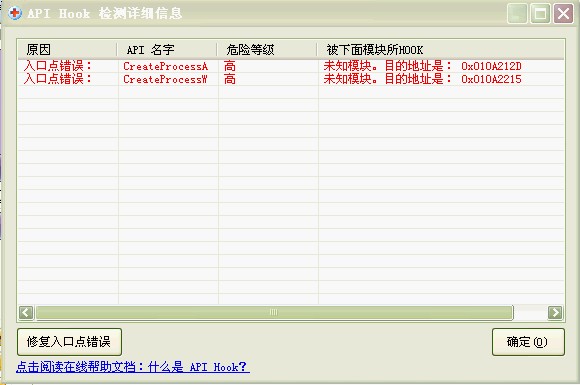 入口点错误:CreateProcessA (危险等级: 高,  被下面模块所HOOK: 0x010A212D)
