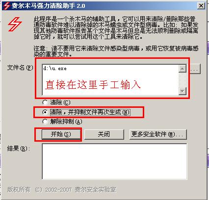 这里下载费尔木马强力清除助手,勾选“抑制文件再生”删除u.exe
