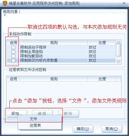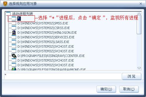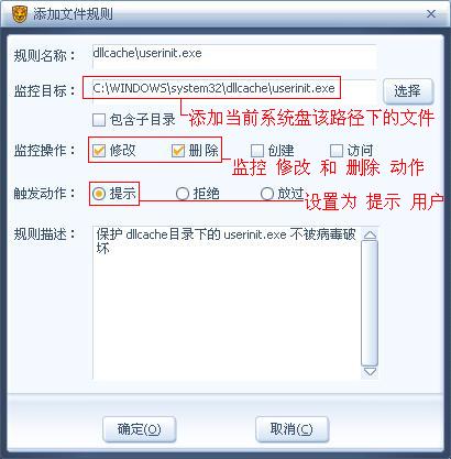 监控目标处:点击“选择”按钮,可以浏览磁盘文件,选择用户当前系统盘符下的 Windows\system32\userinit.exe 文件(XP、2003、Vista 系统),Winnt\system32\userinit.exe 文件(2000 系统)
