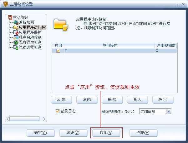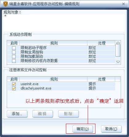 触发动作:勾选“提示”,当有对 userinit.exe 文件的 修改 和 删除 动作被监控到后,会提示用户,用户可根据触犯动作的进程,来判断是否正常进程,如果是正常进程选择 放过,反之选择 拒绝