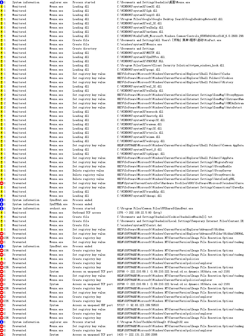 下图是在影子系统下运行你的样本,用Tiny的Track'nReverse监控的实时记录。此毒的行为已经有了个大致轮廓。
