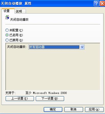 在运行中输入gpedit.msc进入组策略-用户配置-管理模块-系统里有个关闭自动播放(默认:未被配置)点击打开设置如图:(在设置了这项后,如果光盘是原版系统盘会在WINDOWS下认不出的,这时又要设置回去)