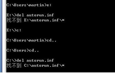 4)  系统安装完成后,第一次启动进入安全模式,显示所有隐藏及系统文件。运行命令cmd首先利用del命令将各分区下的aurorun.inf,pagefile.exe删除,比如: