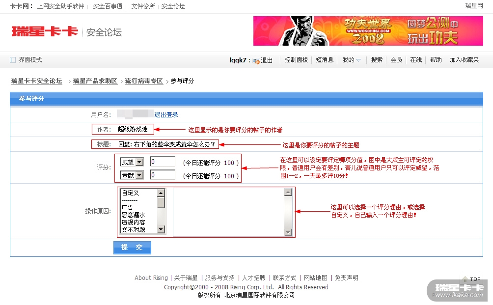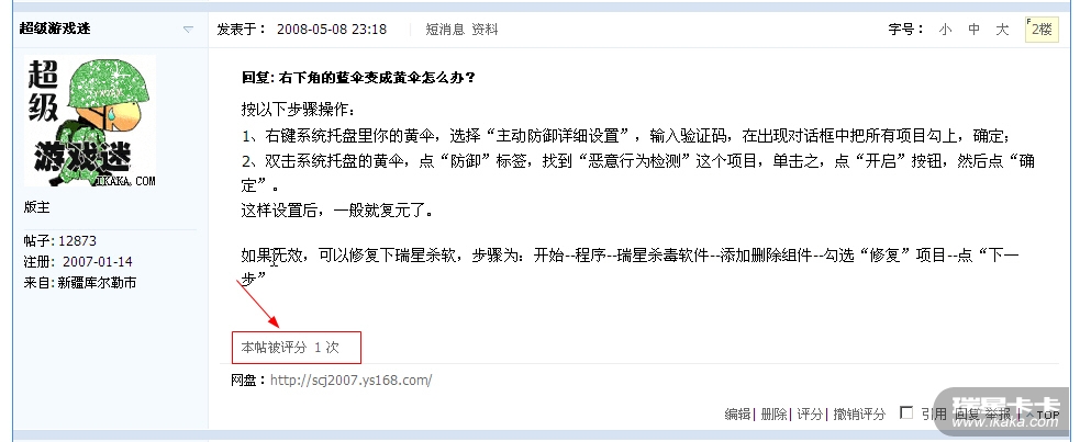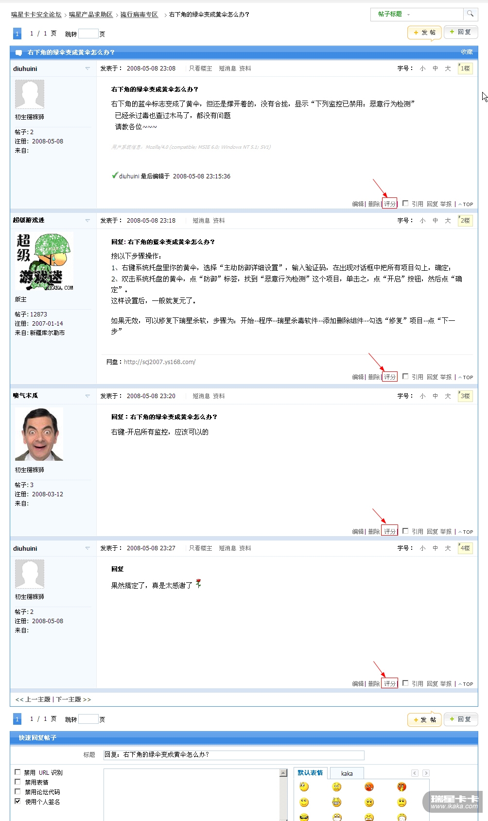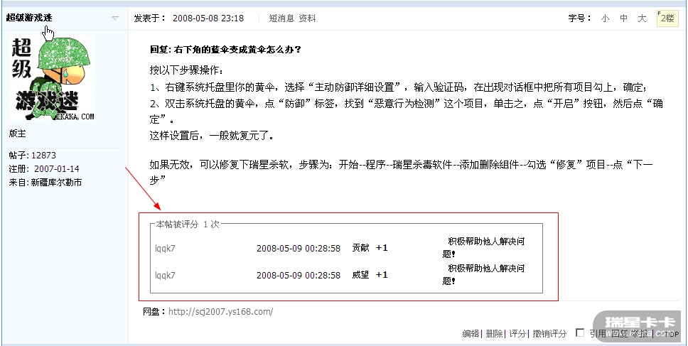 新版卡卡论坛已经可以对帖子进行评分了,但是知道这个功能的朋友可能并不多,特此截图示意!