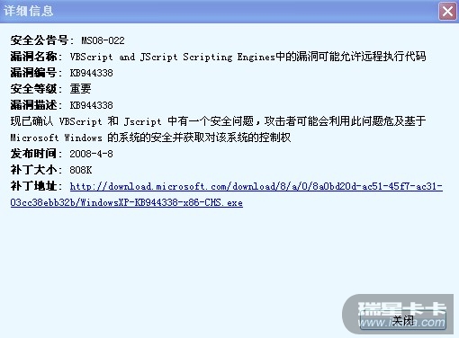 今天一打开电脑,QQ医生提示有新漏洞 ,我立即用瑞星漏洞扫描,可未发现,用卡卡助手也是,漏洞名称。MS08-022,附详细信息,不过如果漏洞是真的,瑞星的反应有点慢,会让人感觉失望的