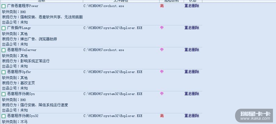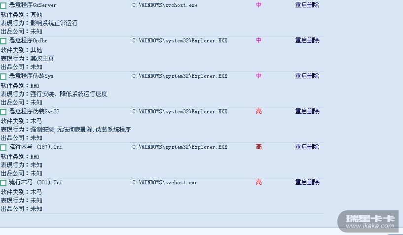 卡卡 发现木马 说重启计算机按删除 ,每次重启都有,而且瑞星还发现不到病毒 是什么原因啊