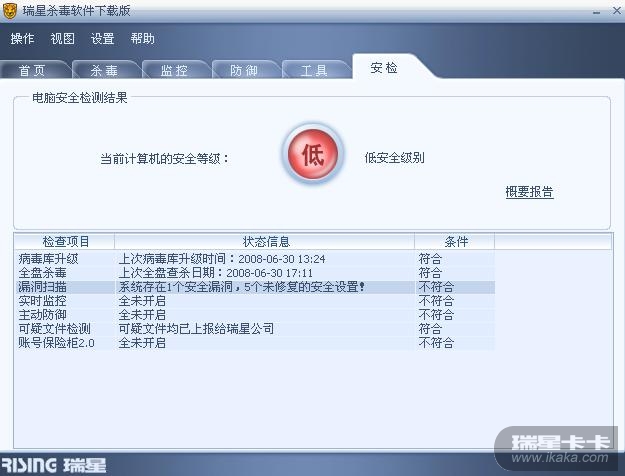 回复: 瑞星的绿伞开着但安检等级低,监控防御不符合什么意思?