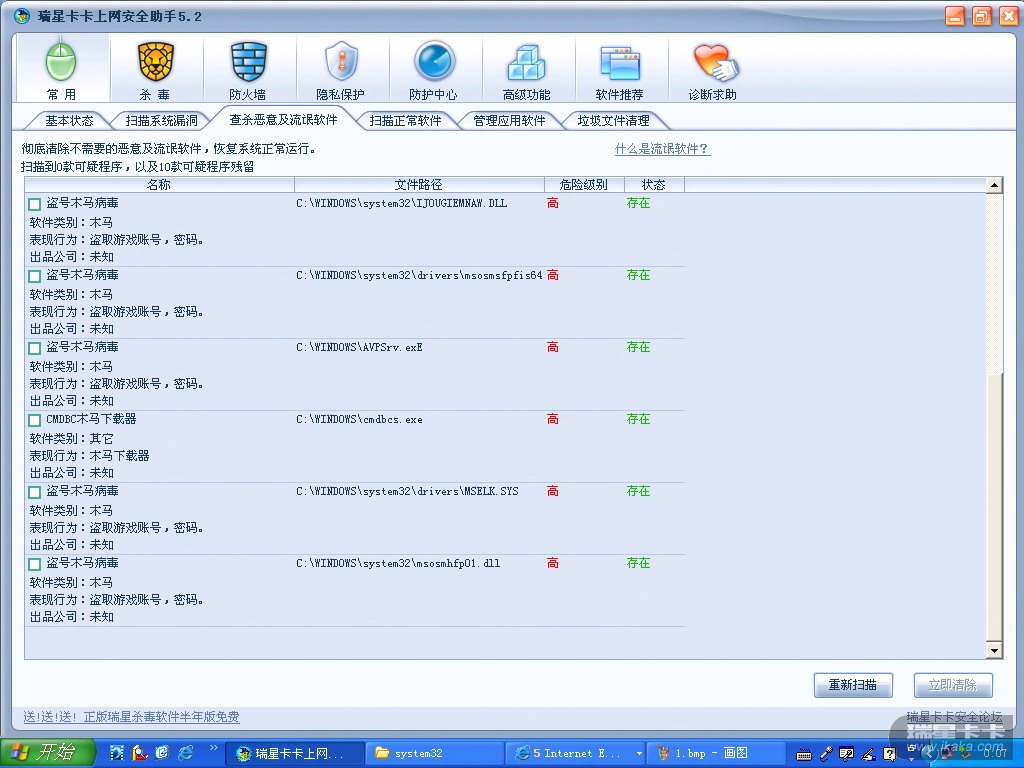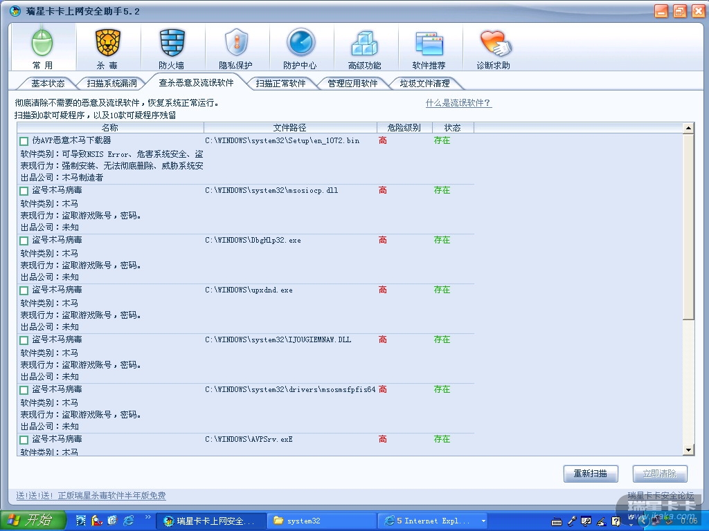 前两步处理机子后,运行瑞星卡卡安全上网助手后,发现10款流氓软件和木马,清除后杀毒,再查就查不出来了,然后再运行帖子前两步,情况依旧,有没有高手帮忙呀?谢谢了,在线等!