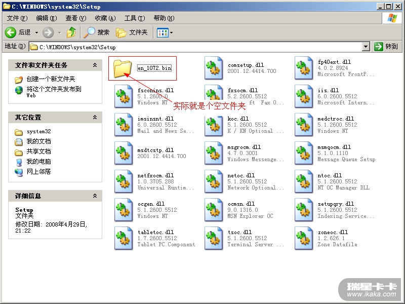 你的电脑很安全,那些都是些空文件夹,你也可以自己试试,点开始——运行,输入cmd,点确定,在命令行中输入md %SYSTEMROOT%\system32\setup\en_1072.bin,按回车,这个命令就是在%SYSTEMROOT%\system32\setup下建了一个名为en_1072.bin的文件夹,卡卡虽提示有木马,实际只是个空文件夹