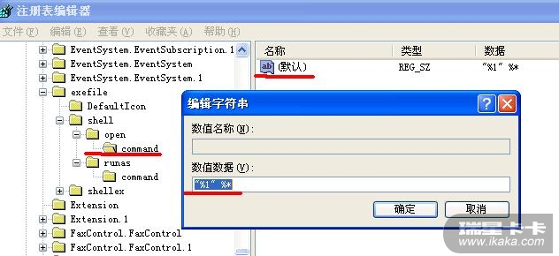 展开HKEY_CLASSES_ROOT\exefile\shell\open\command这个注册表子项,双击注册表右侧窗格的(默认)这个值项,将“数值数据”右侧的字符串修改为下图所示的数据,即"%1" %*(注意:引号是英文输入法状态下的,第二个引号与之后的百分号之间有个空格),然后,重启电脑看看: