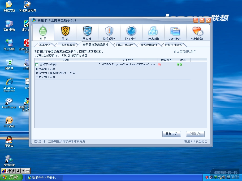 aaccbbdd,还是不行啊,删除了文件,但是用卡卡扫描还是会出现,用瑞星第一次杀可以杀,但一重启后在杀还是有,真郁闷。在安全模式下杀也是如此。