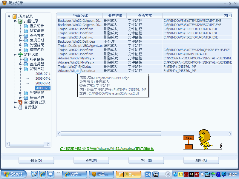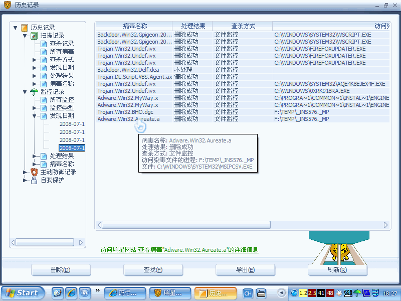 另外补充两点就是重启之后我用瑞星扫描过没有发现病毒,还有就是被瑞星查出来的两个病毒的记录我截图在附件里.