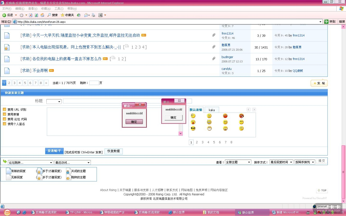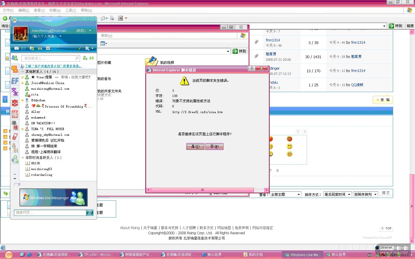 我是和邻居用的一个路由上网.前天被他ARP攻击染上木马.后来装了杀毒软件和防火墙后,没有再死机.但是老是弹出上面两种窗口.很犯,附件里是我的扫描记录.大侠们帮忙看看吧.谢谢了!