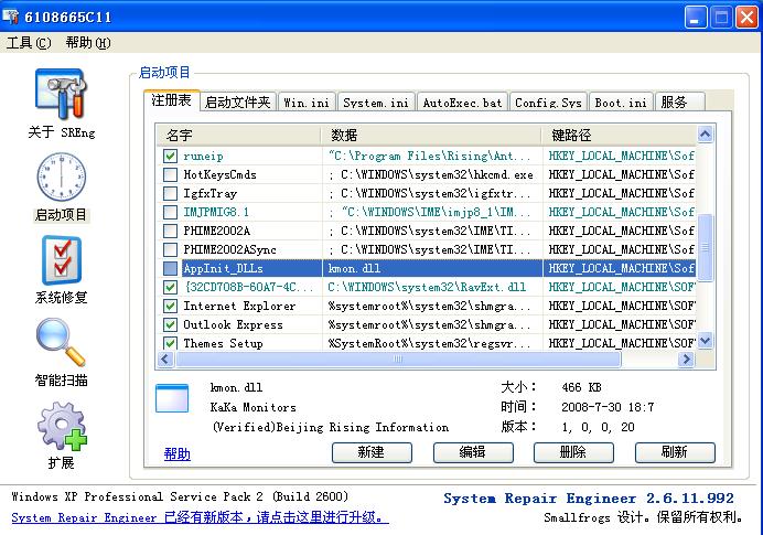 结果今天上网就郁闷了,IE打不开,卡卡助手说是F盘的EREAD(一个阅读器,看小说用的)有个文件怀疑是可疑后门程序,全盘杀毒什么都没有,其它的QQ什么的都行,联网也没问题。只有电驴的内置浏览器可以打开,不好用。另外,运行SREng的启动项目时弹出一个警告: