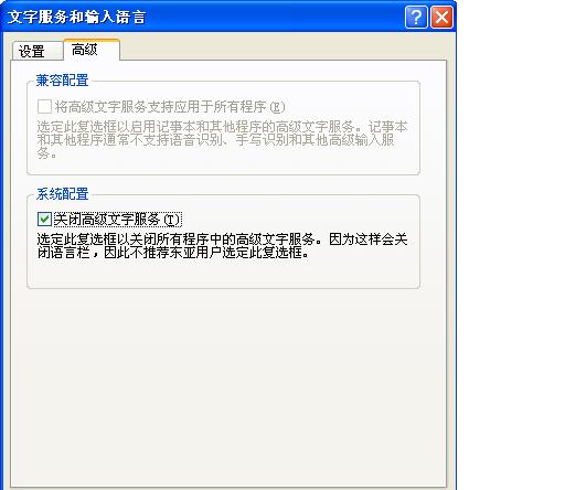 我的电脑上的输入法总是无故消失,且打开区域与语言选项,其中的语言栏里面的文字与语言服务中的详细信息,在高级选项卡中的系统配置项里,关闭高级文字服务这个复选框总是打钩(如下图),取消不掉,重启后仍然自动回来。所以无法使用输入法?(此时本人用另一台电脑打字求救的)