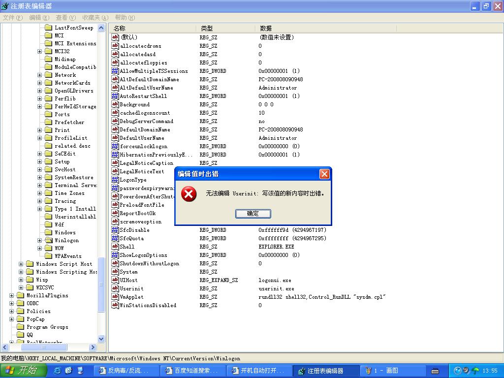 我打开后值为userinit.exe,EXPLORER.EXE。别人说把EXPLORER。EXE删除就可以了不过我一删除就提示为。 无法编辑 Userinit:写该值的新内容出错