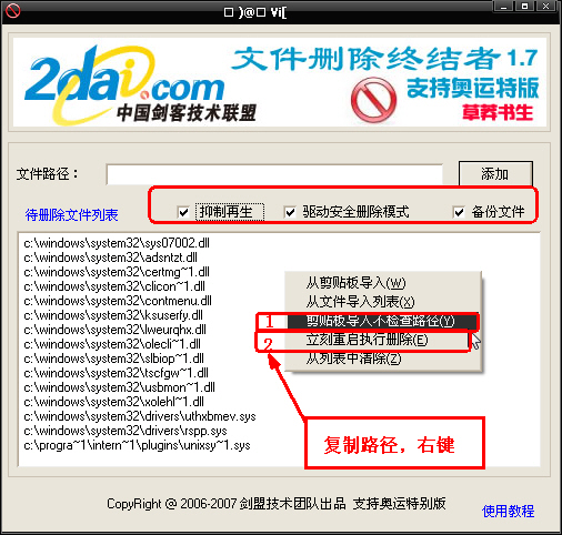 使用说明:删除时复制所有要删除文件的路径,在XDELBOX待删除文件列表,右键---从剪贴板导入不检查路径,右键----立刻重启删除