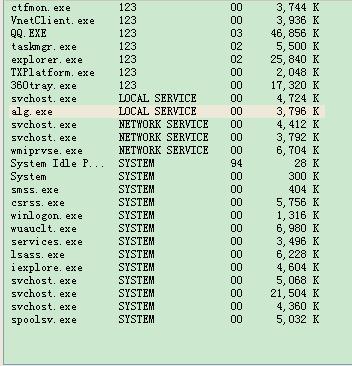 当你结束了,补丁的那个窗口看任务管理器中进程有什么变化?