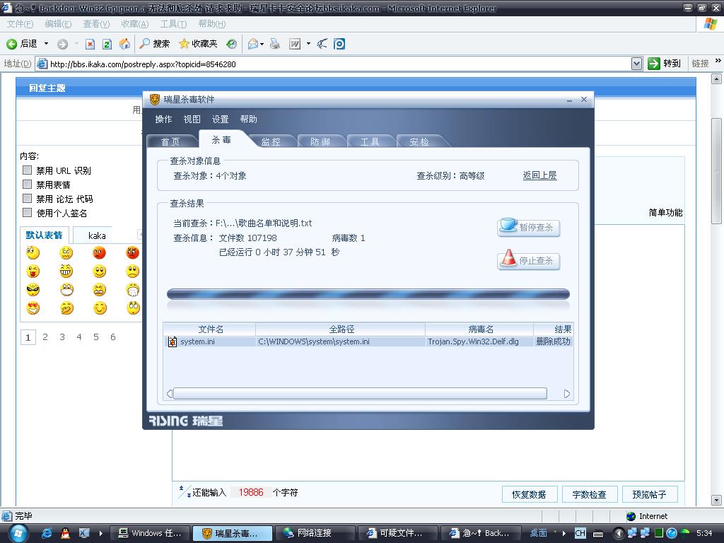 今天我在卡机登陆之后立刻打开了任务管理器,在登陆并连接网络之后就可以看到system.ini 出现这个进程,于是我就将其结束掉,在我点结束的同时 瑞星监控 弹出窗口 提示C:\WINDOWS\system\system.ini 文件感染Backdoor.Win32.Gpigeon.a 病毒,最后我只能做隔离。