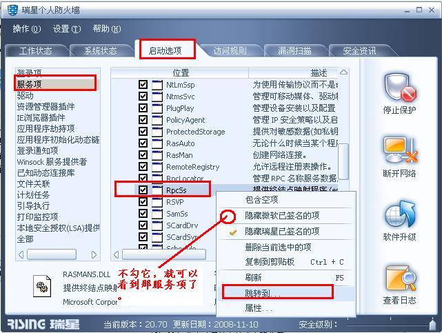 首先在瑞星防火墙中如下图操作,定位注册表中的那rpcss的服务项