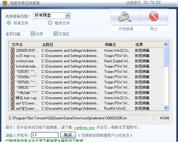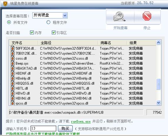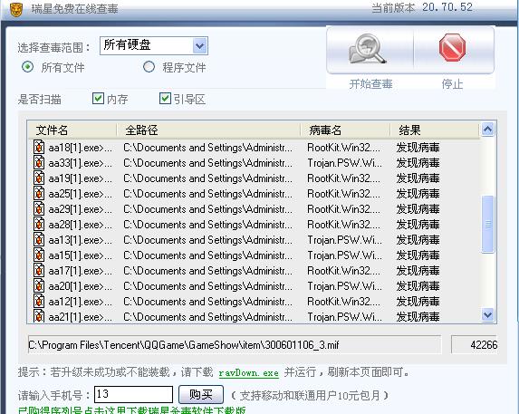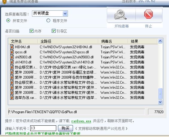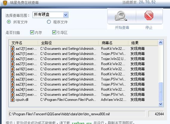 今天上了个网址 看电影 说要让下QV开头的一个播放器 具体什么名我也忘了,下载了一半 我不想看了 就取消下载了 ,我有下载了 《口袋西游》,下载完后我觉得不对劲,玩着玩着 我发现 任务栏里的“小绿伞”没了,然后想打开瑞星杀毒 可是怎么也打不开 卡卡也打不开  什么提示也没有 ~~~~~~~~我想尽了办法 下载别的杀毒软件 也是同样打不开 ,最后我重启机子想用瑞星的开机查杀 看行不行,毒倒是查到了 两个,上面也说清除了,可是瑞星还是用不了,机子启动的速度也慢了,还原也打不开了,没辙了我就用在线查毒 结果~~~~~~,51个毒了,就连单位的文件也染毒了!!!!!!!!!!!!