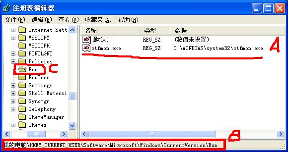 1、进入注册表编辑器,找到并单击[HKEY_CURRENT_USER\Software\Microsoft\Windows\CurrentVersion\Run]这个注册表子项后,在注册表编辑器右侧窗格内,右键添加一个名称为ctfmon.exe的值项,双击该新建的值项后,赋值为"c:\windows\system32\ctfmon.exe&quo