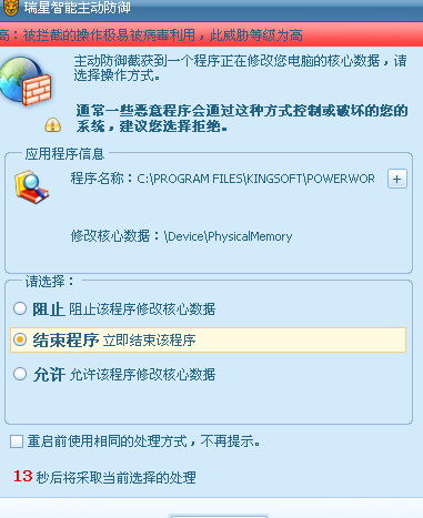 每次打开金山词霸2006瑞星就提示有程序在修改电脑核心数据,要我选择操作方式,所提到的程序就是金山词霸2006,而修改核心数据是\Device\physicamemory.(如附件)