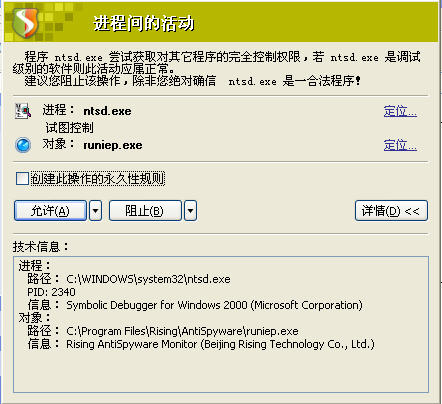 此下载器试图通过修改ntsd.exe内存,控制卡卡助手。病毒试图创建文件时,瑞星主防报警(选择禁止,图1)。