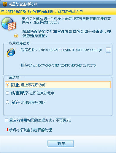 接下来,有一系列注册表改动。并试图改写hosts文件(被瑞星主防拦截了,图3)。
