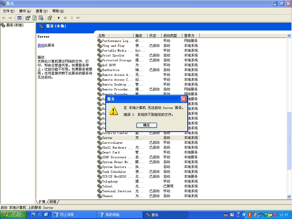 公司局域网内(工作组)部分XP系统电脑不能被其它电脑访问,但其可以访问其它电脑。导致本电脑共享文件时出错,信息为“没有启动服务器服务。此时尚未创建共享资源”。到“服务”里启动“server”服务时,提示:“在本地计算机无法启动server服务,错误2:系统找不到指定的文件”。本人已经将winsock重置;从其它正常电脑上拷贝svchost.exe和srvsvc.dll文件;在“本地策略”里进行了相关设置;并重新安装了网卡,问题依旧,难道一定要重装系统吗?