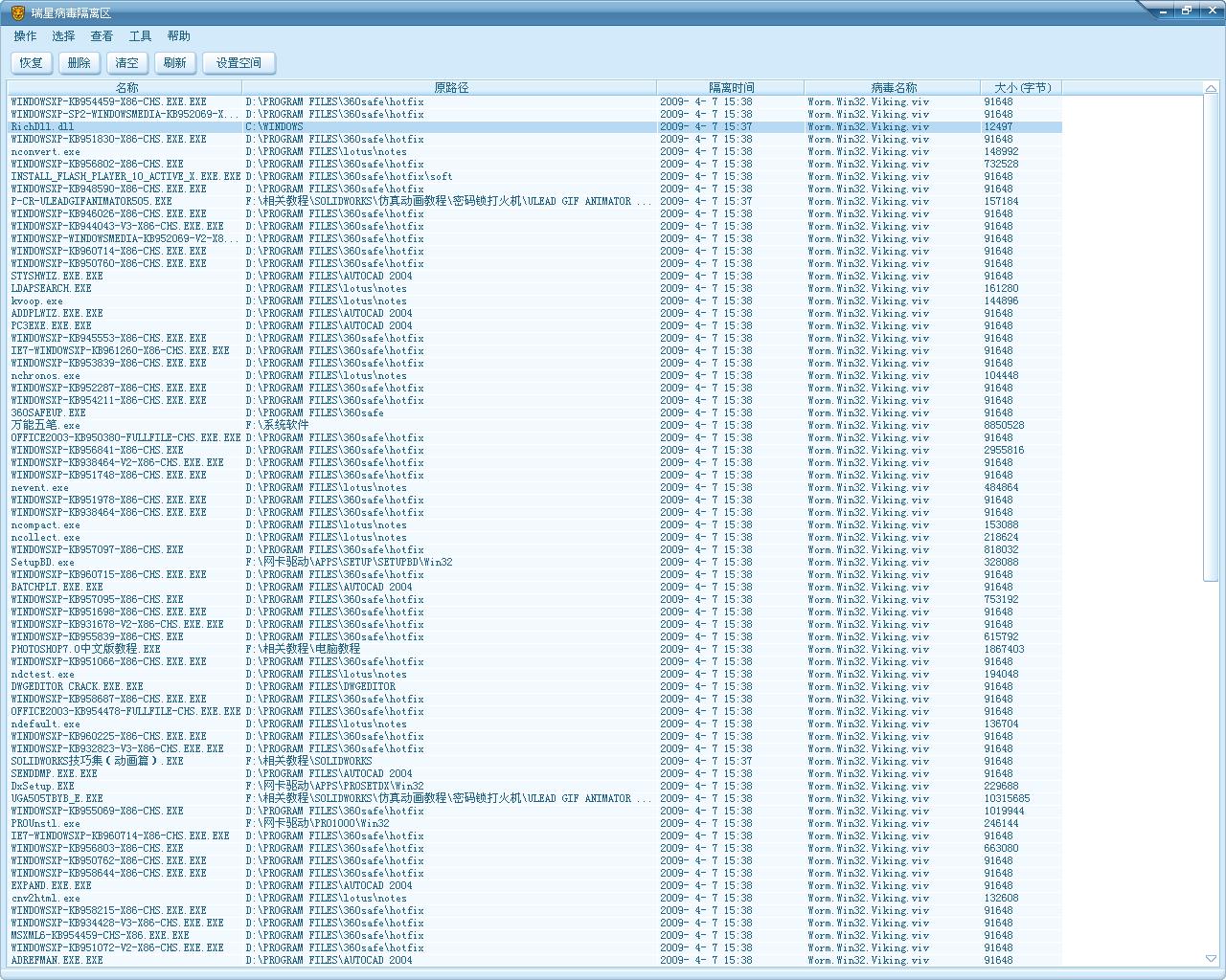 从隔离系统截图看,那些被感染的exe之前瑞星已经将病毒代码清除了,再杀肯定就没有了