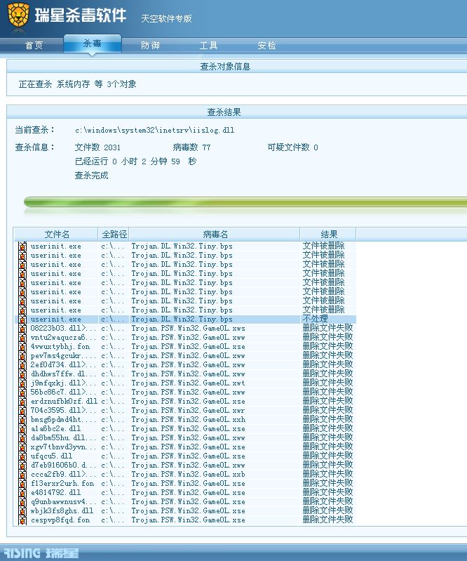 1、瑞星杀毒结果