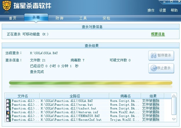 Worm.Script.BAT.Agent.g 路径是H:\SOLA\FUNCTION.DLL>>SCAN.BAT