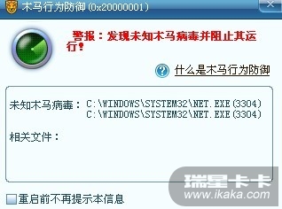 开机后,右下角瑞星的保护伞一直提示:发现未知木马病毒并阻止其运行